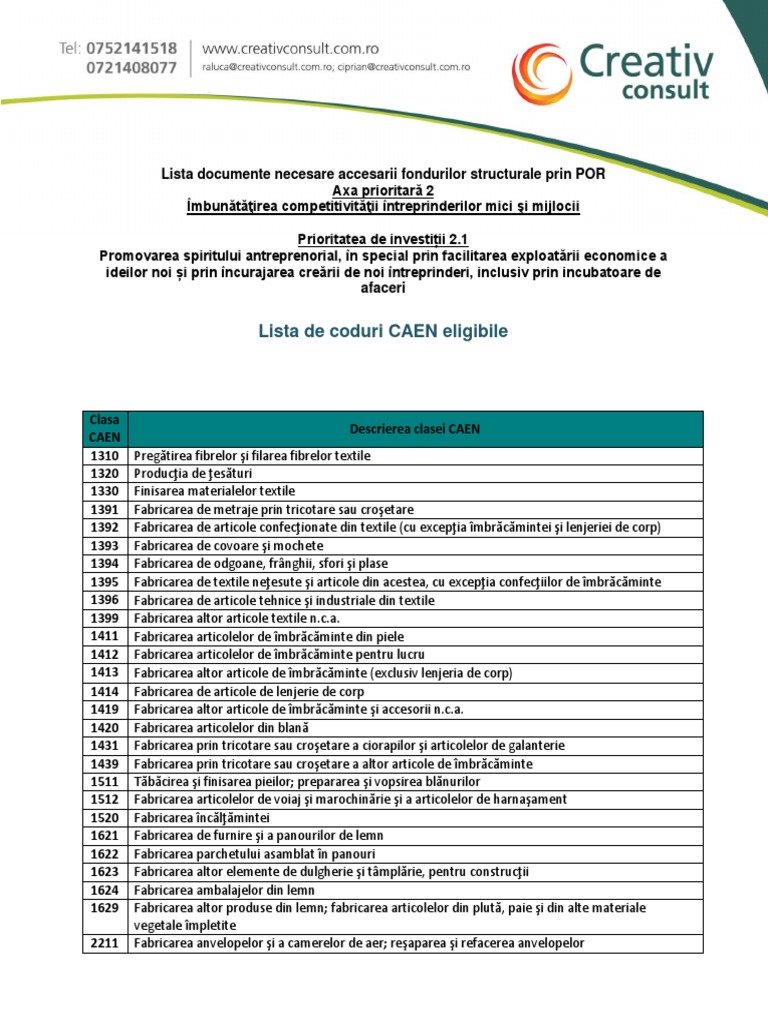 Lista coduri caen 2018 pdf. Coduri caen cod actualizat 2020 lista sectiuni. Lista de documente disponibile pentru a fi descarcate. Lista codurilor caen aferente activităţilor care sunt eligibile la finanţare în cadrul programului start up nation românia n c a. Cod caen actualizat în 2020 pentru firme şi pfa.